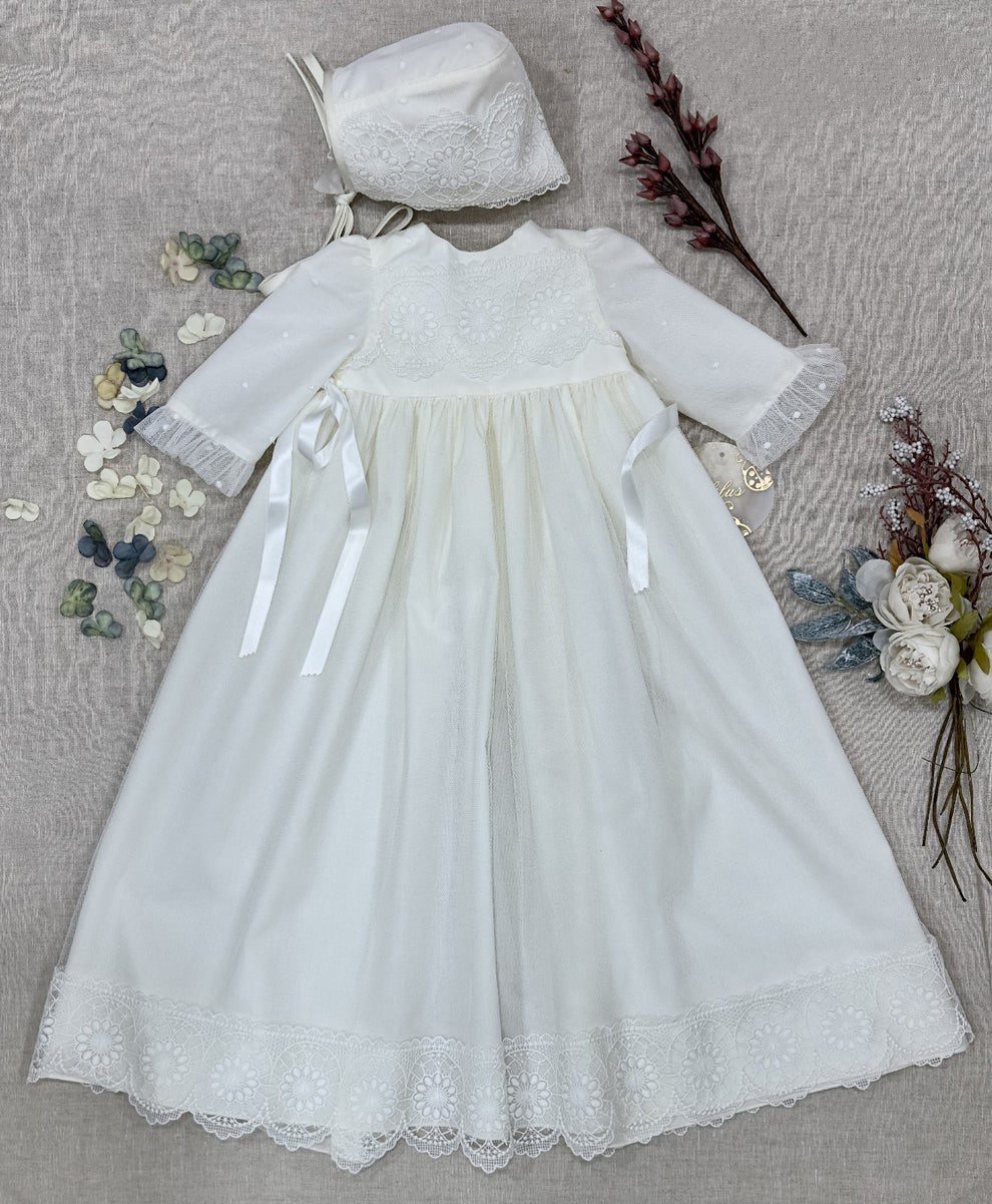 Batón bautizo en tul blanco roto con encajes en cuerpo y falda, manga larga y capota a juego.