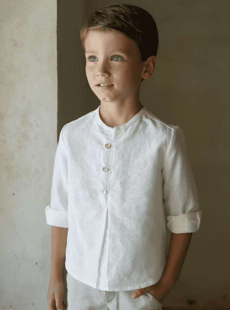 Camisa niño en lino crudo tipo polera, manga larga y cuello caja.