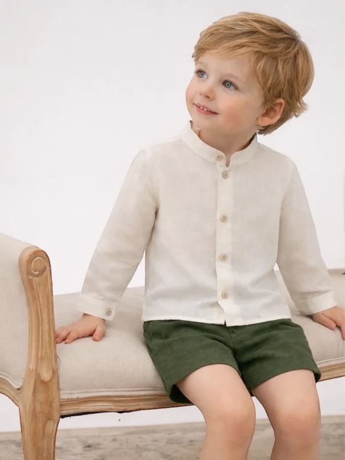 Conjunto niño compuesto por camisa lino crudo, manga larga y cuello mao y pantalón corto en verde oscuro, bolsillos y cinturilla ajustable.