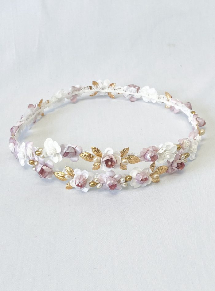 Corona comunión con florecitas de tela, pistilos y detalles dorados.