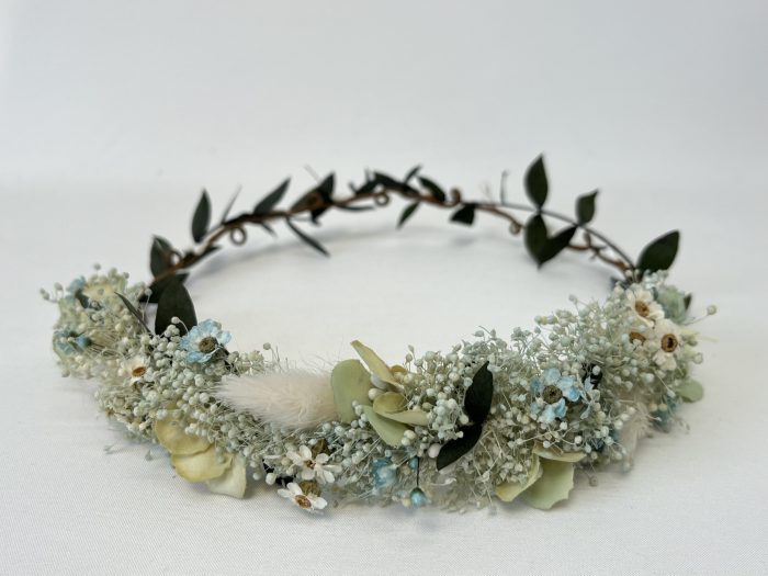 Corona de flores combinadas en tonos verde con pequeñas margaritas, paniculata, espigas, hojas de olivo y pistilos.