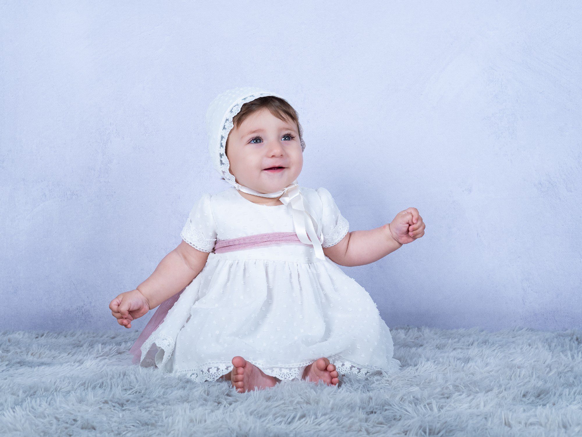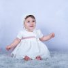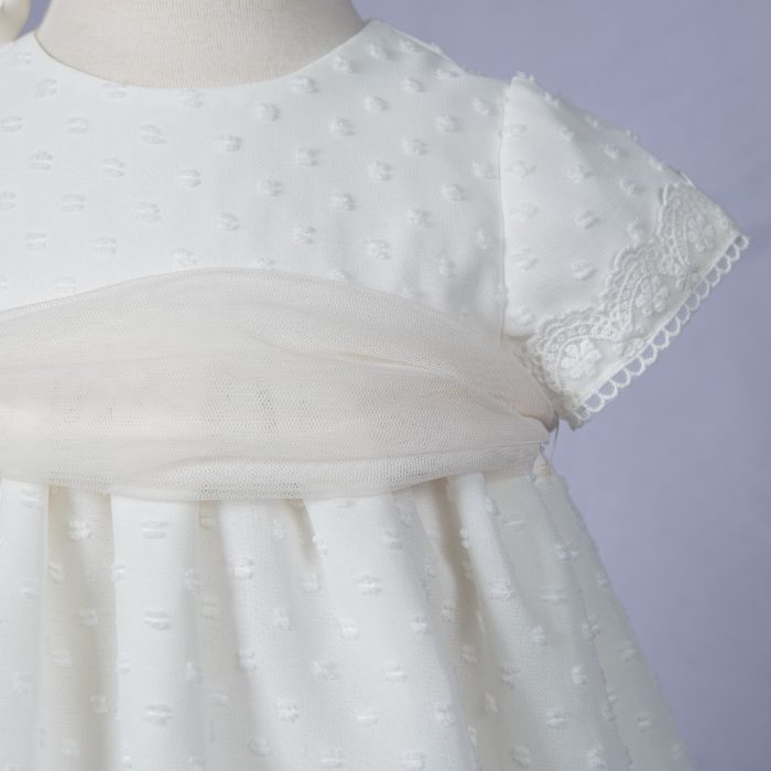 Jesusito bautizo de gasa beige de plumeti, manga corta, con braguita y capota a juego. Lazada de tul en color rosa o beige.