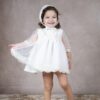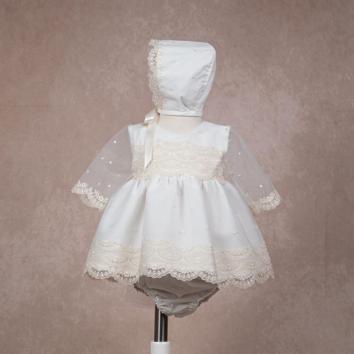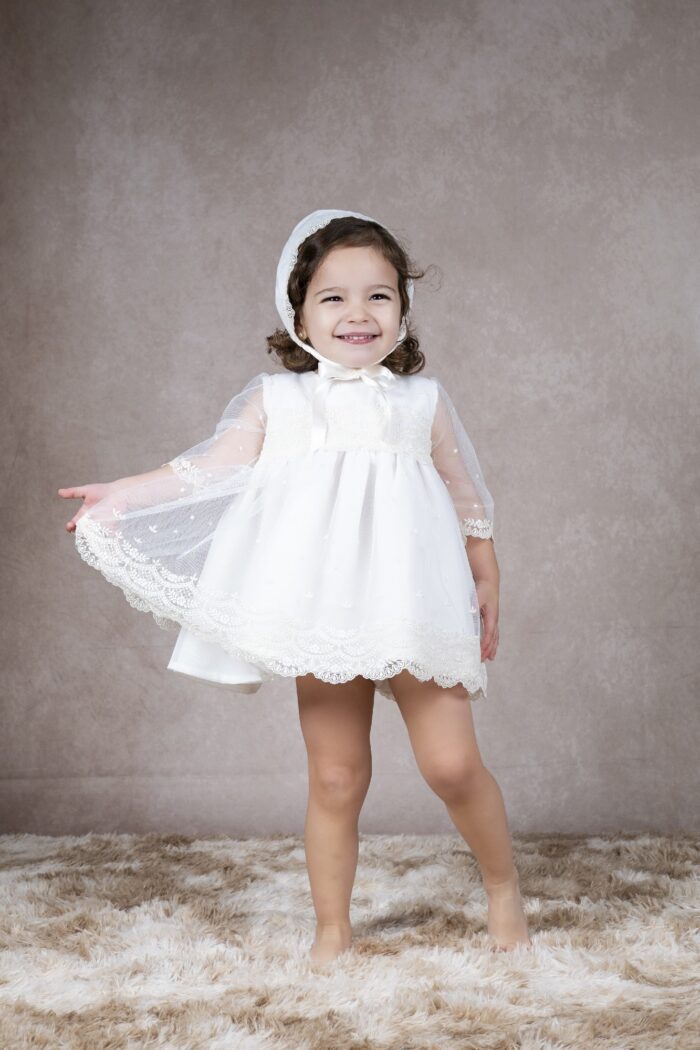 Jesusito de bautizo en tul con plumeti bordado y blondas, manga larga, braguita y capota a juego.