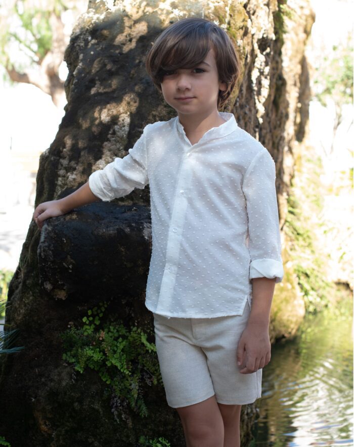 Pantalón ceremonia corto en lino y cinturilla ajustable. Disponible en dos colores: arena y verde agua.