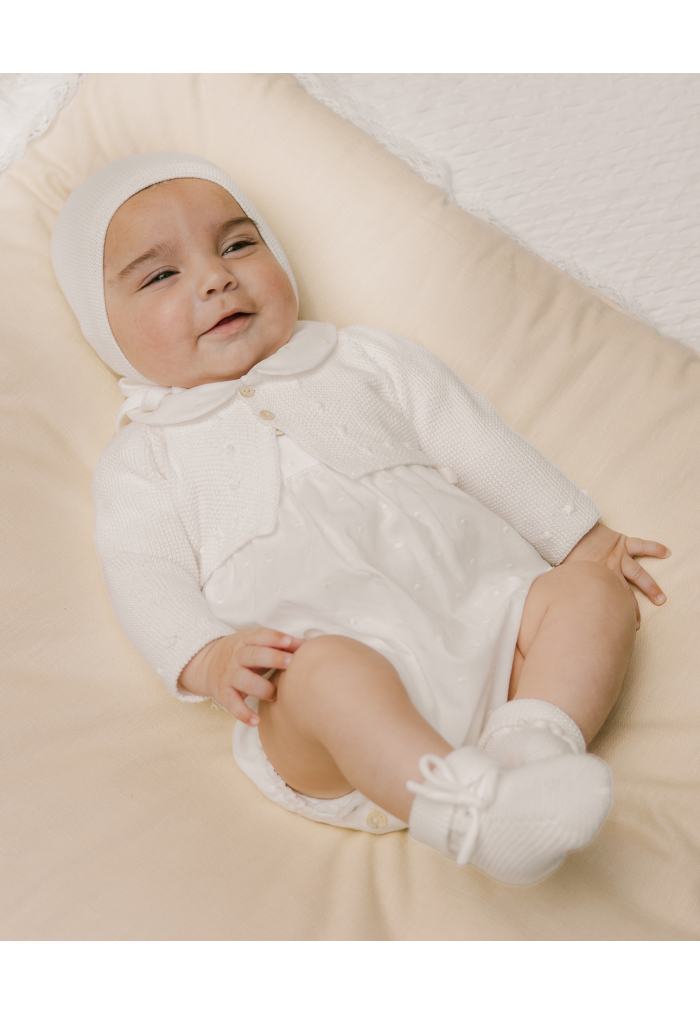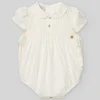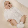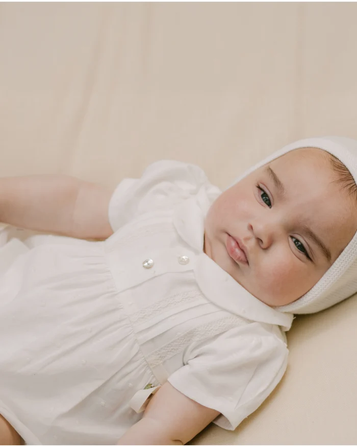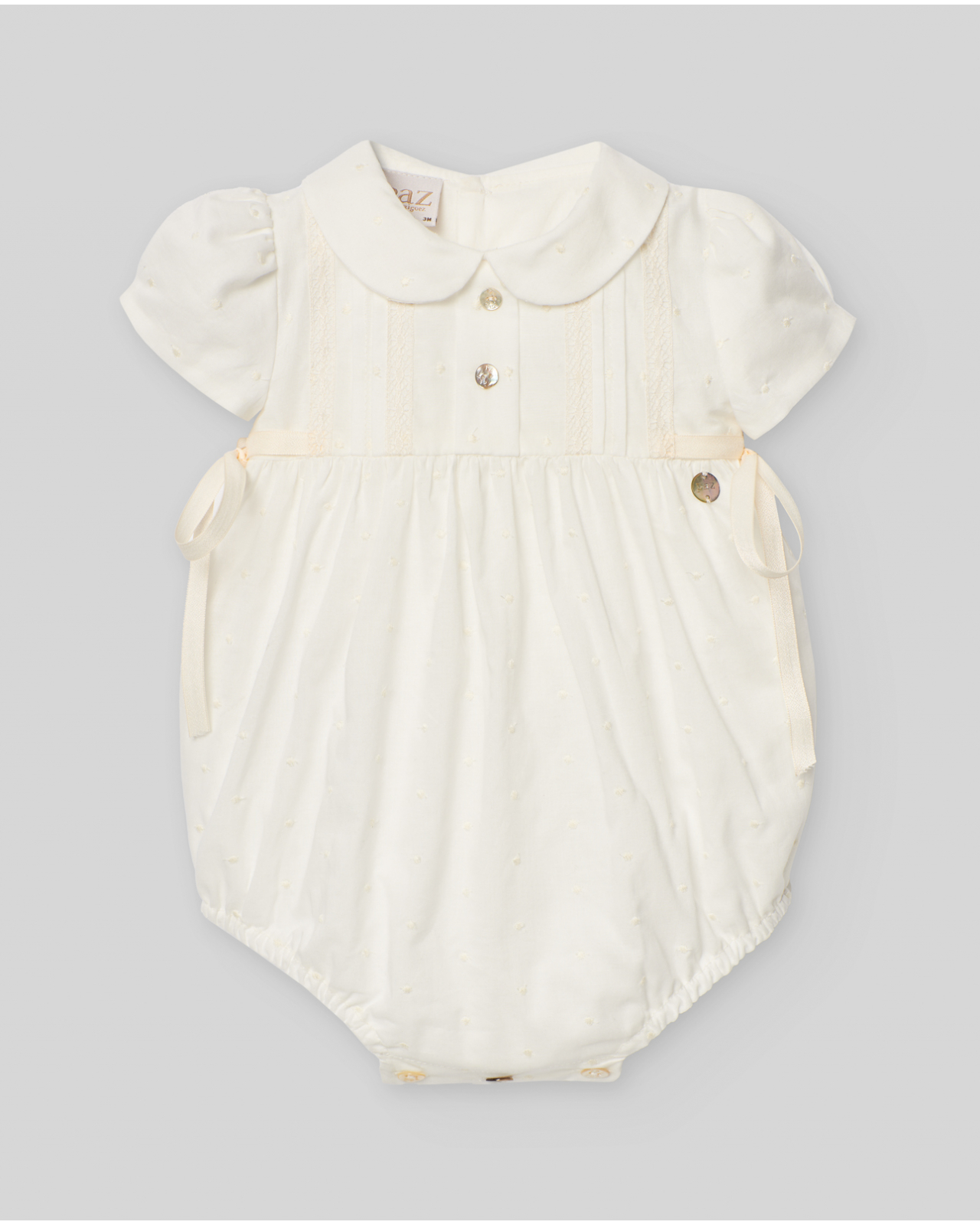 Pelele bautizo en batista beige bordada con cuello bebé, detalle de jaretas, encajes y botones en talle, con manga corta y lazos laterales. Capota no incluida.