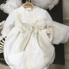 Pelele bautizo en lino con manga al codo, detalle de puntilla en talle y mangas, lazada en contraste y capota a juego.