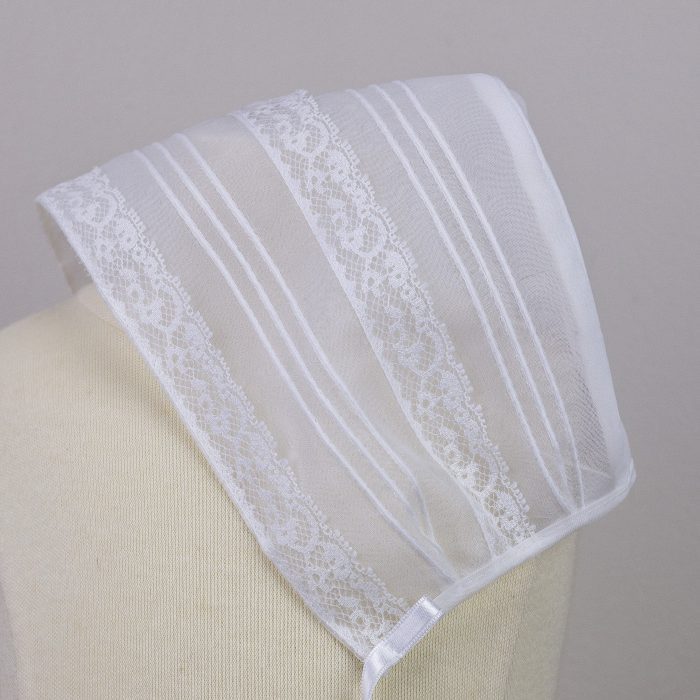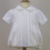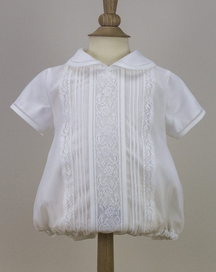 Pelele bautizo en gasa cristal blanco roto con encajes y jaretas, cuello bebé, manga corta y capota a juego.