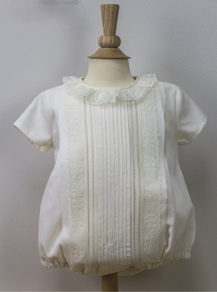Pelele bautizo en batista beige con jaretas y encaje, manga corta, cuello caja y capota a juego.