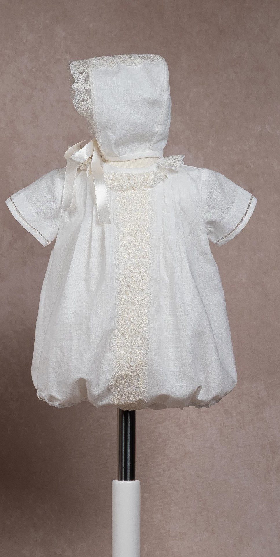 Pelele bautizo en lino crudo, manga corta con detalle de vainica, tablitas en talle con encaje y capota a juego.