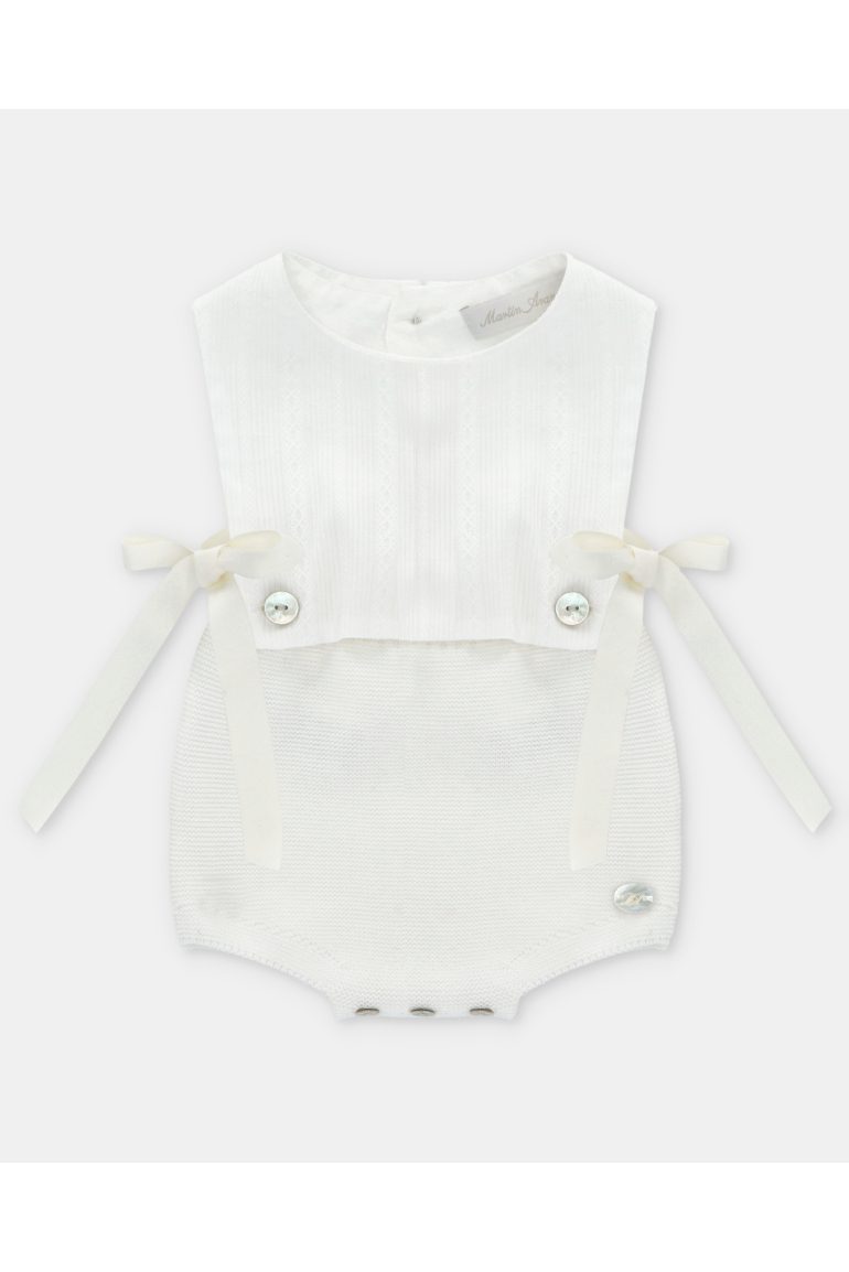 Ranita bebé con cuerpo de tela y braguita de punto, disponible en tres tonos: beige, verde y celeste.