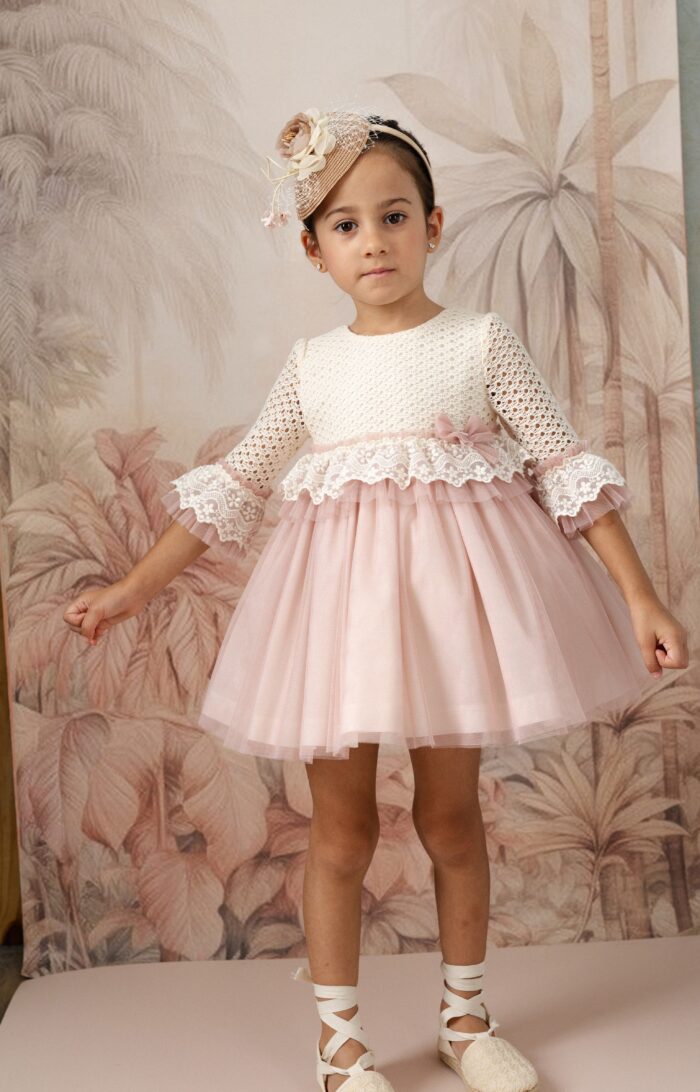 Vestido ceremonia con cuerpo de guipur, manga francesa y falda de tul rosa.