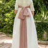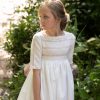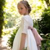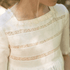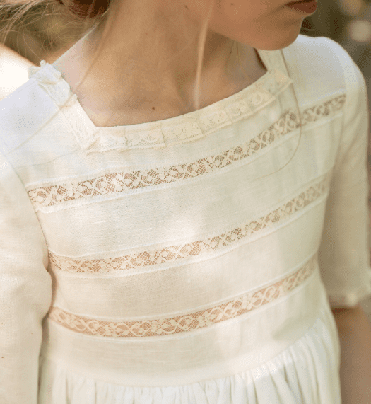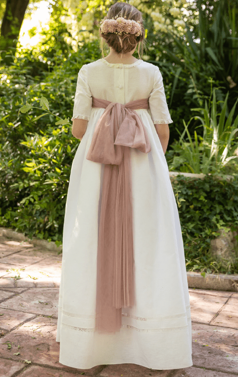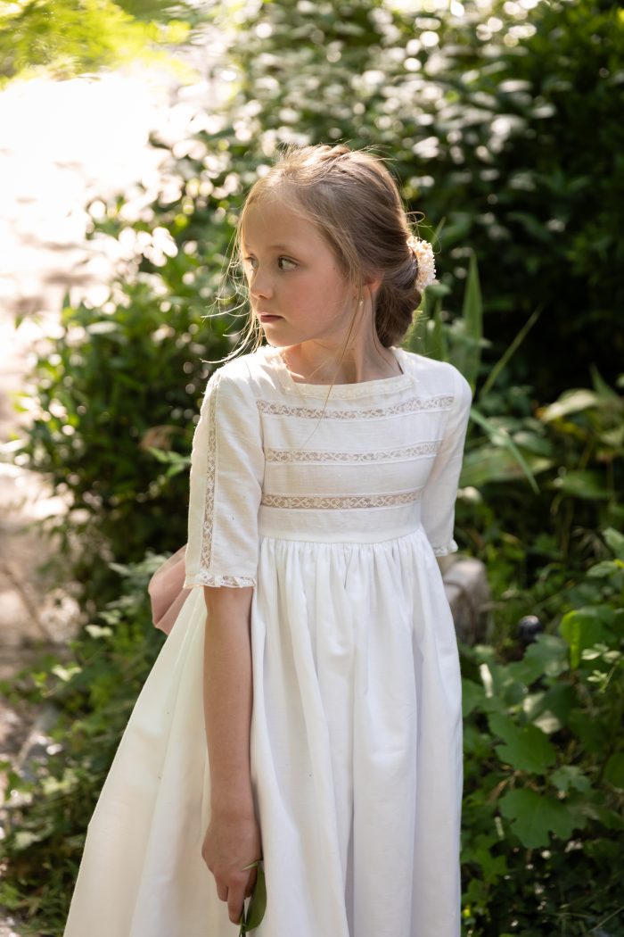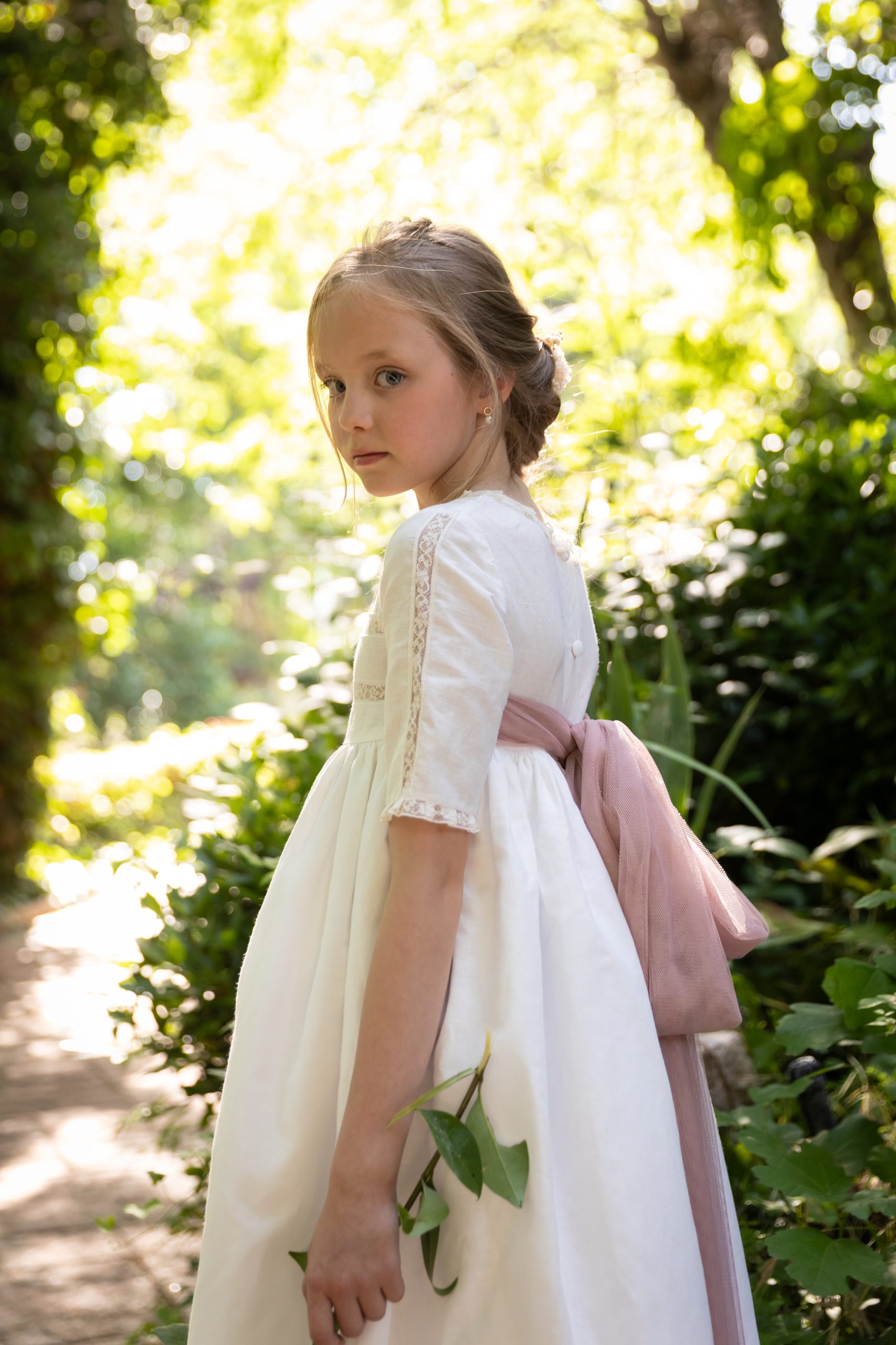 Vestido de comunión en lino blanco, cuerpo con entredoses de valencienne horizontales, escote rectangular terminado en puntilla de encaje, manga con entredós vertical y rematada en puntilla de encaje, falda con dos filas de entredoses. Lazada en tul rosa nude, cosida a laterales del vestido.