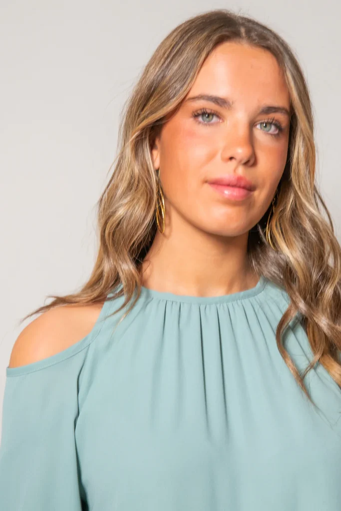 Vestido de gasa verde agua con cuello a la caja y hombros descubiertos.